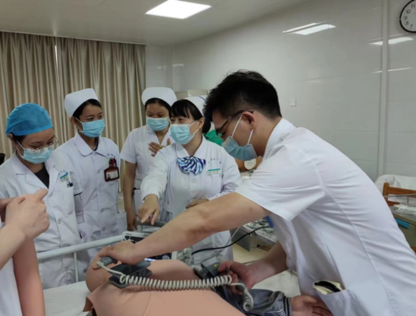 邹献章副主任(右一)和王兰兰护士长(右二)指导心肺复苏赛前训练