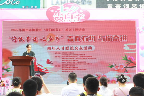 8月7日,柳州市“我们的节日”系列主题活动“传统节日·七夕节”青春有约,与你奋进青年人才交友联谊活动在保利商业广场火热举行,活动由共青团柳州市委员会、中共柳北区委人才工作领导小组办公室指导,由中共柳北区委宣传部、柳北区团委、妇联、总工会和共青团柳州市公安局委员会、共青团广西科技大学第一附属医院委员会、共青团中国邮政集团有限公司柳州市分公司委员会、柳州高速公路运营有限公司柳州北收费站等单位共同举办,来自全市各行各业的80位青年早早来到现场、浪漫赴约。