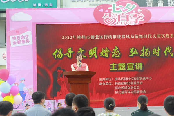 在活动开场仪式上,市公安局的青年代表周柳莎以“倡导文明婚恋 弘扬时代新风”为主题进行宣讲,自己践行并号召广大青年共同树立正确的婚姻观、家庭观,为之后成家立业打下坚实基础。
