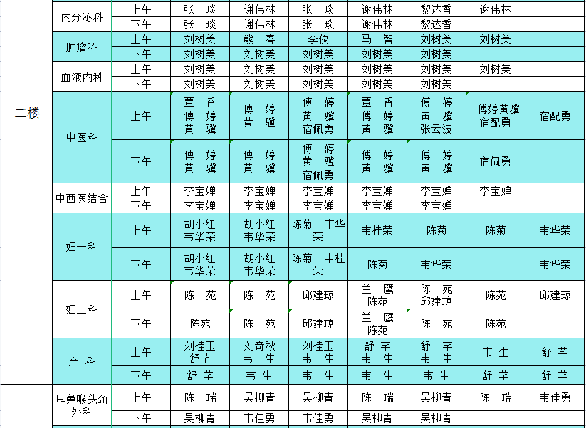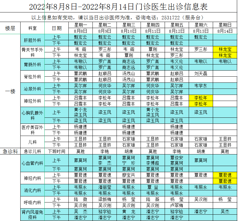 2022年8月8日-8月14日门诊医生出诊信息表