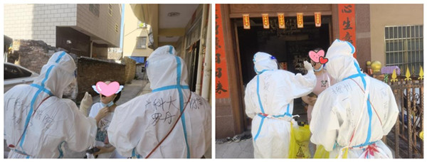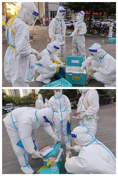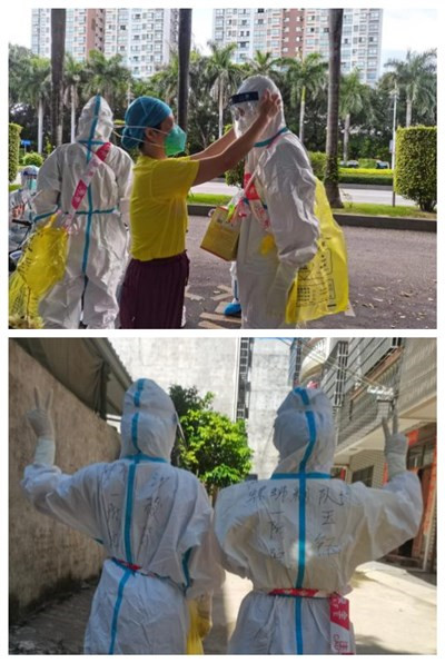 有这样一个训练有素队伍每天不畏酷暑,每天都在北海市街头走街串巷:上门采核酸。他们穿着密不透风的防护服,是一群团结的“大白”。