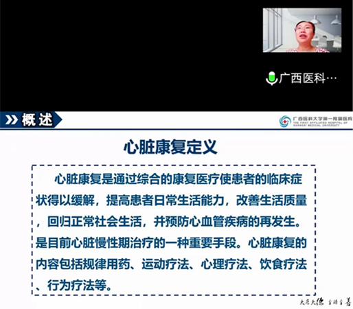 目前,我国心血管病患病率处于持续上升阶段且死亡率一直呈上升趋势。患者对疾病康复关注有所提高,从医院到社区缔造三级康复模式,而心脏康复也尤为重要。7月23日,广西科技大学第一附属医院成功举办线上心血管内科急危重症及心脏康复护理新进展学习班,会议邀请区内多位著名心血管内科护理专家们传授宝贵知识及经验。
