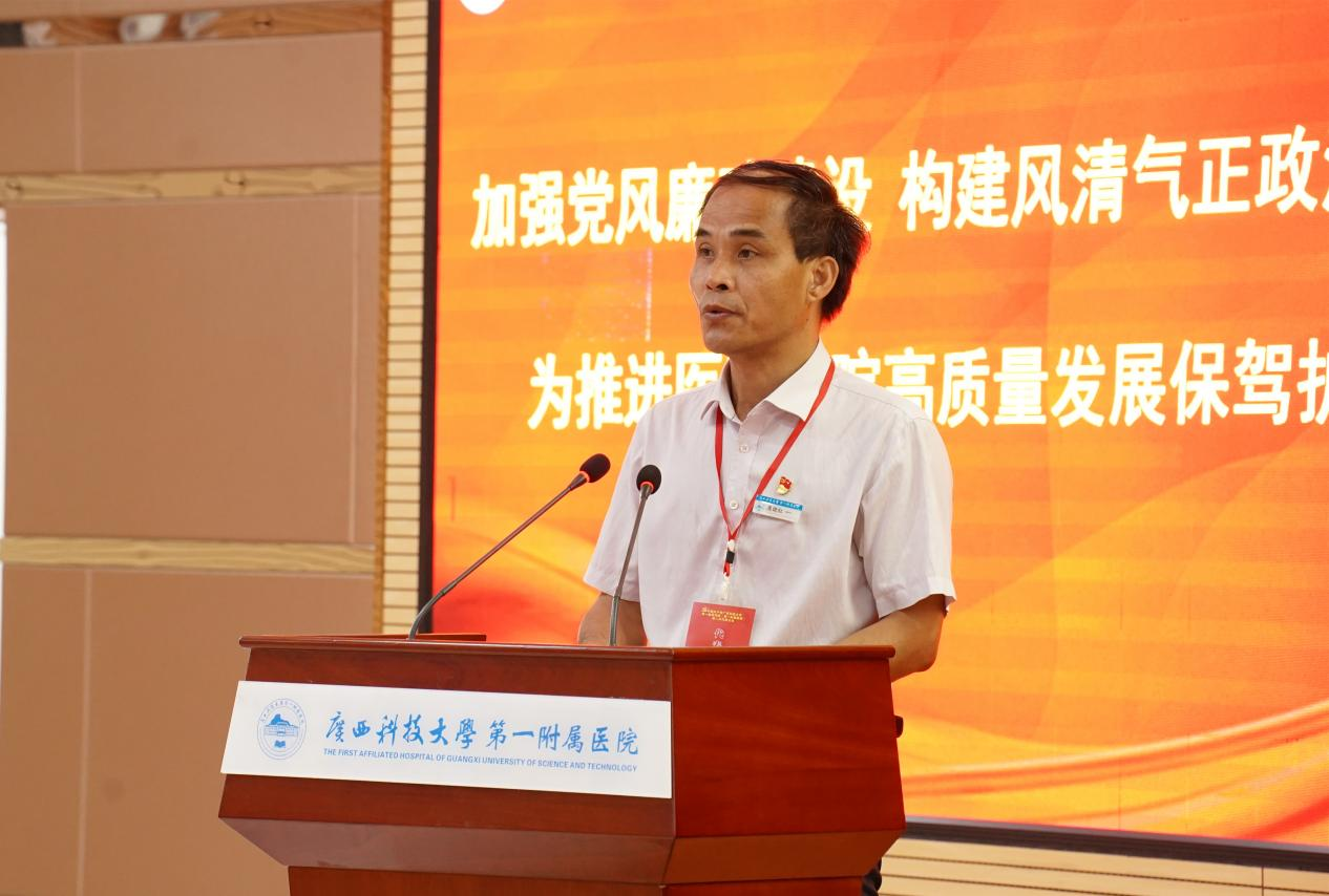 党委副书记、院长覃天致第二次党代会开幕词,他指出第二次党代会的召开,是医院(学院)政治生活中的一件大事,希望全体与会代表,要以高度的政治责任感和使命感,聚精会神,畅所欲言,建言献策,努力把本次大会开成求真务实、解放思想、改革创新的大会,开成统一思想、团结奋进的大会,为把医院(学院)建设成为区域先进特色鲜明的综合性大学附属医院而努力奋斗!纪委书记潘旭作题为《加强党风廉政建设 构建风清气正政治生态 为推进医院学院高质量发展保驾护航》的纪律检查书面工作报告。