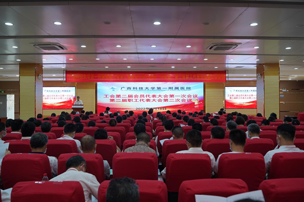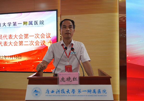 7月16日全天,广西科技大学第一附属医院召开工会第二届会员代表大会第一次会议暨第二届职工代表大会第二次会议。医院全体党政领导班子出席会议,党委书记庞晓红讲话、党委副书记、院长覃天作院长工作报告、党委副书记何曲波主持会议,总会计师向桂云作财务工作分析,职工代表159名、特邀退休职工代表1名、列席代表28名参加了会议。
