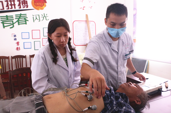 医疗义诊活动提供有内科、外科、妇科、全科等各科室问诊服务和血压、心电图及B超检查。“你这是属于三级的高血压,要吃药控制,而且吃药不能停,不能说有效果就不吃了。日常饮食要清淡,还要经常锻炼身体才行。”服务队医生细心地向村民询问身体状况,了解村民病史,根据村民的血压、心电图及B超检查的结果提供有益于村民健康的建议。青年志愿者干练的操作,专业且耐心的回答让村民点头称赞。对于许多行动不便的村民,志愿者们小心搀扶他们进到检查室进行检查。
