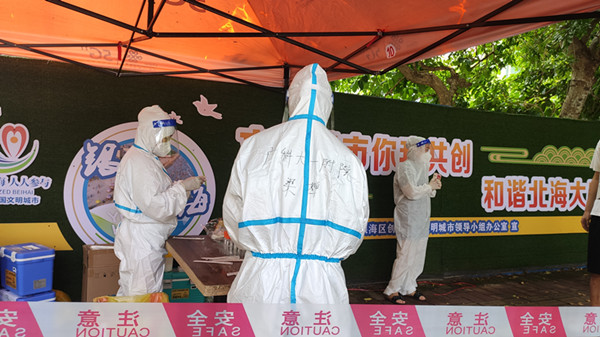 我是广西科技大学第一附属医院援北海核酸检测医疗队小组长郭红波。14号中午11:20左右接到援北海的指令,12点30分准时出发,队员梁婵只能把外地来柳过暑假的弟弟妹妹紧急托付给了舍友。我们的小组有10个成员,有多次参加抗疫援助的老队员覃慧婷医生和邓文旗老师等,也有第一次参加的新队员韦剀培和杨正杰。特别面对酷暑,大家都“疫”无反顾。