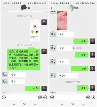 次日上午8点,韦主任到科室看望病人,再次认真询问发病过程,为他作了全面检查,接下来的任务是进一步查明真正的原因。虽然考虑是发热血小板减少综合征,也高度怀疑与与蜱虫或者恙虫有关,但最好找到相关证据,并且从源头上加以重视,否则可能还会有其它的病例出现。随后,本着对人民的健康高度负责的态度,他又电话通知远在老家的亲戚去协助病人妻子细细寻找,还发了相关的识别图片。大约2小时后,老家那边传来的消息,在病人自家的狗身上找到了!就是传说中的蜱虫!紧接着继续又追踪,病人喜欢在山里找野货,家里的4只狗及邻居家的2只狗,都与他特别亲,他每天一大早就带着一大帮“护卫”进山,而且每隔离10天半月都会在狗狗身上找到这些小小的蜱虫。因此,病因完全明了!目前该病例病情得到有效控制,但仍然需要进一步的观察治疗。