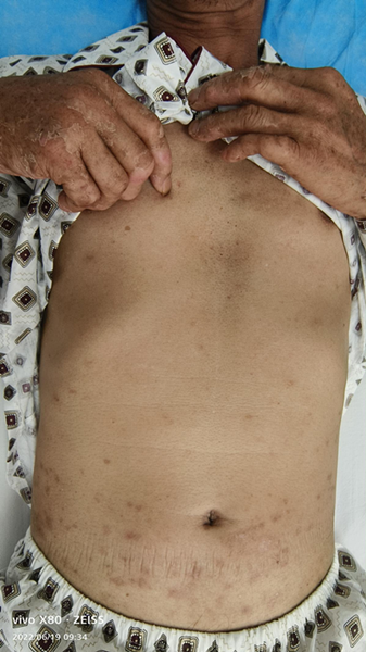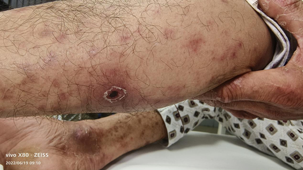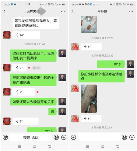 “我堂哥得了急病,几天了都没晓得什么病。他们讲血小板好低,还发烧,想转去你们医院找你看”。上周六(6月18日)晚上9点32分,广西科技大学第一附属医院急诊科主任、医院首席急救医学专家韦建革接到了老家亲戚打来的电话,因为风雨导致时断时续的声音让韦主任立即警觉起来,赶紧询问:“你堂哥在哪?发高烧?呼吸急促?血小板低?具体情况如何?有监护吗?”得到病人在融安某医院住院的消息后,韦主任说:“立刻叫陪人加我微信发视频过来,我要评估病情,要不要派救护车,是不是要去重症科?”10多分钟后,病人儿子发来微信视频,只见病人坐在床边,呼吸有些急促,面色灰暗,全身有皮疹。韦建革主任询问了相关情况,马上要求对方再认真查看有没有皮肤焦痂之类的特征。果然,2分钟后第二段视频中,看到了病人左小腿的明显焦痂。