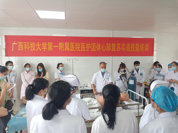 作为广西科技大学直属附属教学医院,急诊科团队意识到县乡医疗机构急救能力的提升可以造福更多的百姓,挽救更多患者的生命。因此,自2009年以来,韦建革主任带领急诊团队通过多种渠道向院内外特别是桂中地区普及急救技术,心肺复苏团队实战演练是其中一个优势项目。近年来,广西科技大学第一附属医院急诊科专家们的足迹踏遍了桂中大地,所到之处广受欢迎。急诊科承担的省级科研项目《城乡医疗机构心肺复苏团队实战演练的一体化研究》获得广西卫生适宜技术科研立项,由医院首席急救专家韦建革主任主持。该项目已经完成柳州市6县的县人民医院及中医医院培训,也对柳州18家乡镇卫生院培训,同时来宾市的忻城县、金秀县人民医院也接受了培训。2019年开展的全市基层医疗机构急救比赛中也将该项目作为比赛内容之—。
