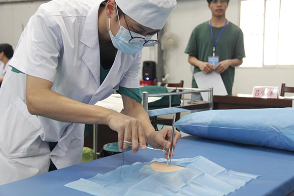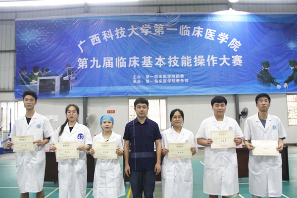 大赛分为专科组和本科组,通过临床思维测试、体格检查、外科操作、脊柱损伤搬运及心肺复苏五个项目考察参赛选手的临床思维和团队协作能力。经过八个多小时的激烈角逐,吴永利、郭冰荣获本科组个人赛一等奖,蒋博文、刘可钦、梁彩霞荣获专科组个人赛一等奖,本科四队荣获本科组团体赛一等奖,临床(专)2001班获得专科组团体赛一等奖,其他选手及班级分别获得二,三等奖及优秀奖。