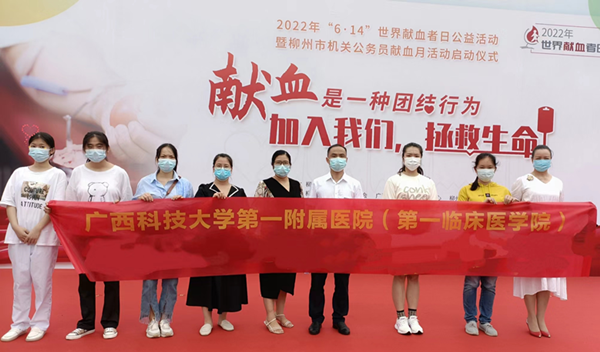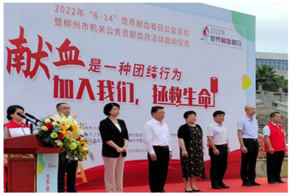 6月14日上午9点,2022年世界献血者日公益活动暨柳州市机关公务员无偿献血月活动启动仪式在柳州市文昌综合楼南广场举行。出席活动的市领导有:市委副书记邱明宏同志,市人大常委会副主任金忠同志,副市长卢柳屏同志,市政协副主席罗铭同志,参加活动的还有市卫生健康委、市红十字会、广西血液中心的负责同志,各城区政府,柳东新区、阳和工业新区(北部生态新区)管委会的分管负责同志以及市直各机关单位无偿献血代表、志愿者代表。副市长卢柳屏在活动中代表市政府作了重要讲话,对2021年柳州市无偿献血工作给予肯定,同时呼吁广大市民积极参与无偿献血,共同促进柳州市无偿献血工作迈上新台阶,推动全市无偿献血事业持续健康发展。