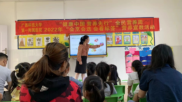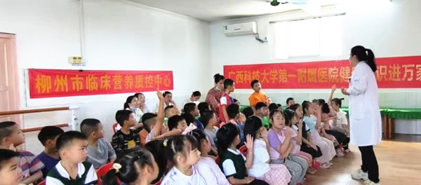 在给孩子们传授营养知识的同时,邀请他们的家长和老师们一起参与学习,增加普及面,广西科技大学第一附属医院的临床营养师们用通俗易懂又生动的话语,吸引孩子们认真听讲,并和营养师积极互动,同时用专业技术知识为家长和老师们日常挑选和搭配食物问题进行答疑解惑。营养讲座深受孩子、家长和老师们的喜爱。