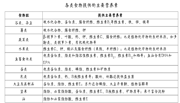 1. 认识食物营养特点。不同的食物营养特点有所不同(表↓↓↓),了解食物主要营养特点,按类选择食物是合理膳食的第一步。
