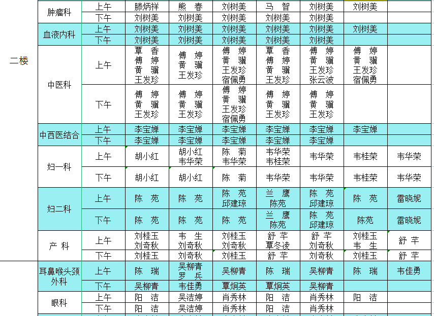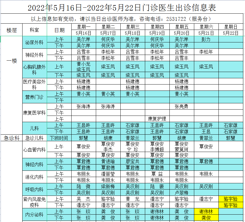 2022年5月16日-5月22日门诊医生出诊信息表