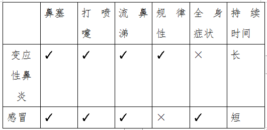 变应性鼻炎:俗称“过敏鼻炎”,是特应性个体接触过敏原后由IgE介导的鼻黏膜炎症反应性疾病,其主要症状是反复喷嚏、清涕、鼻塞和鼻痒,患者常伴眼痒、结膜充血和(或)流泪。到这里您有可能有疑问了,这些症状跟感冒差不多呀,为什么不是感冒呢?那我们来进行一下区别呗!