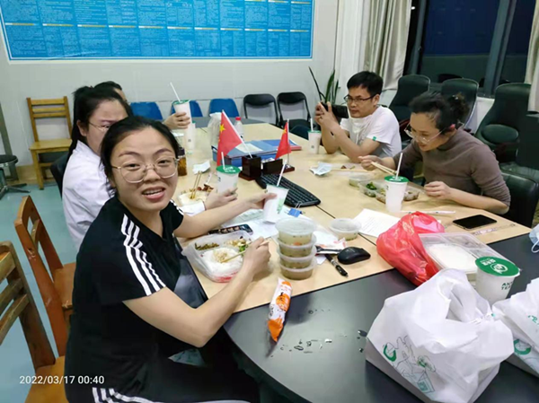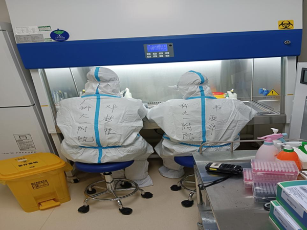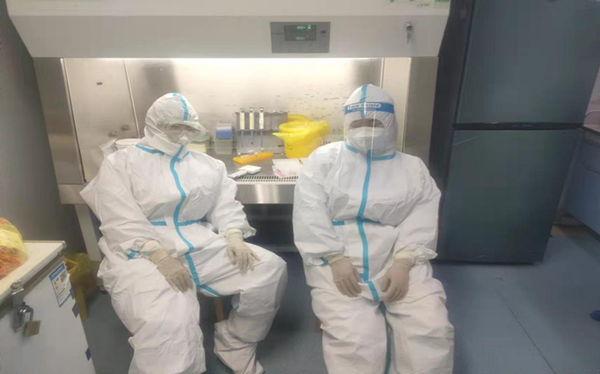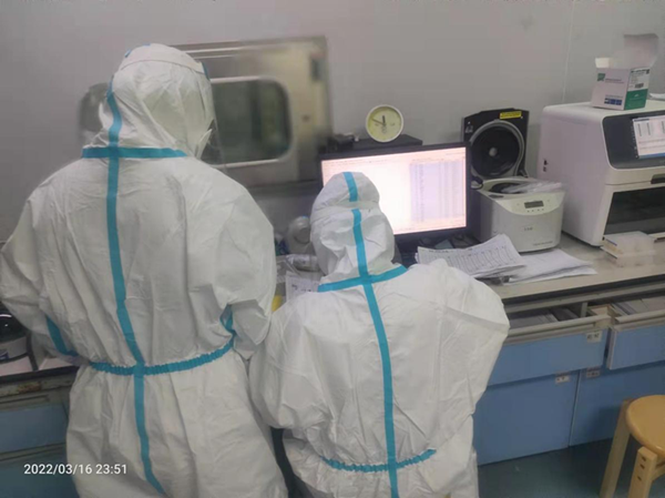 医学检验科的工作人员从早上接班开始,分工合作,争分夺秒,在完成当天日常工作的情况下,立马加入核酸检测的工作中,相互分组搭档,在大家看不见的实验室里,我们每天有序的进行着重复的工作:标本接收、拆包、提取、加样、扩增、审核结果、汇总、废弃物的高压处理。看似简单重复的工作流程却相当费力,比如单手拧瓶盖到手指起泡、手动点样时聚精会神看清楚是否都吸上样本、配置反应体系时反复多次震荡混匀反应液等等。PCR实验室24小时不停歇,所有检验人也不停歇,穿上防护服,戴好护目镜和手套后,一开始就是一整天的战斗,经常大家下班已是凌晨两三点,手臂和肩颈等都已浑身酸痛,但是完成当日检测任务都很高兴,再累都值得。