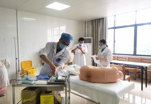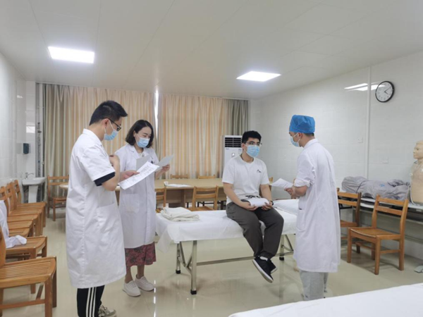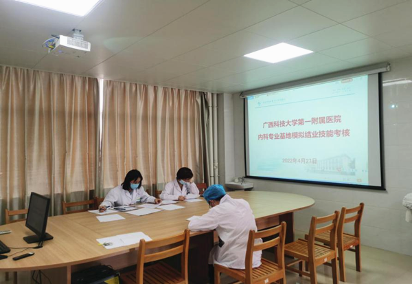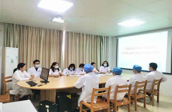 4月27日,广西科技大学第一附属医院住院医师规范化培训内科专业基地开展住培学员结业技能模拟考核。考官由监考经验丰富的内科专业的8名指导医师担任,2019级内科专业的学员参加了考试。
