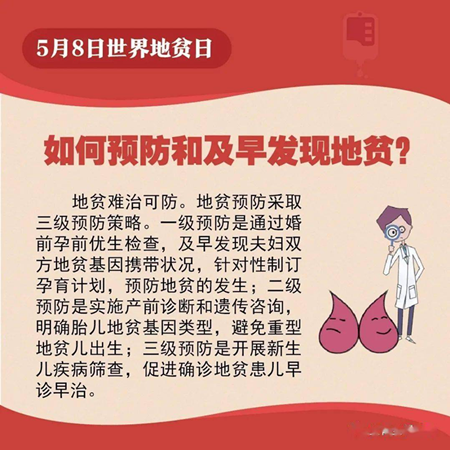所以,高风险地区育龄夫妇双方应该主动尽早到医院进行地中海贫血筛查预防重型地贫儿出生。