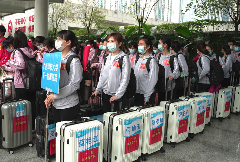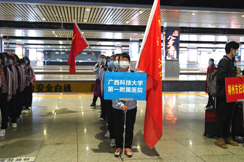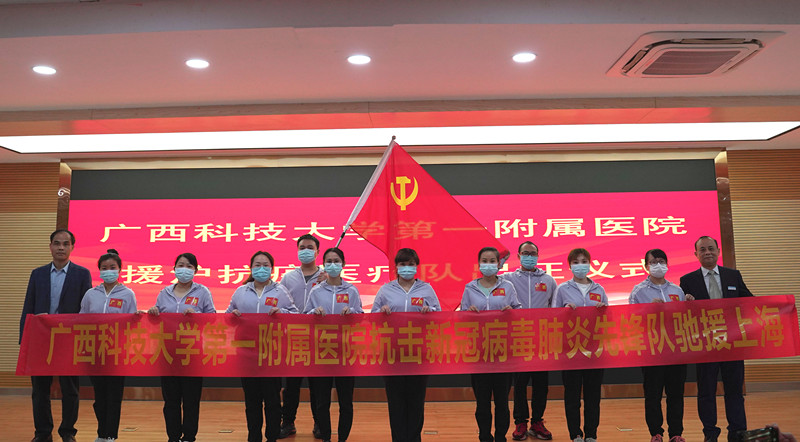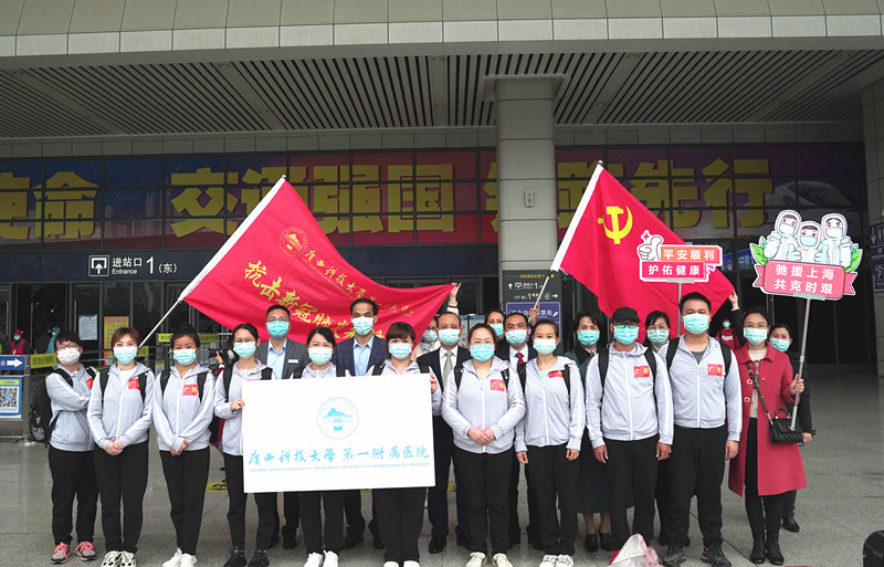 为全力支持上海市进行新冠病毒肺炎医疗救治工作,根据自治区新型冠状病毒感染的肺炎疫情防控工作领导小组指挥部的统一部署,广西科技大学第一附属医院紧急抽调10名具有丰富新冠肺炎防控工作的医护人员组成医疗队,随柳州市第三批援沪医疗队106名队员一起,于4月18日上午启程奔赴上海。