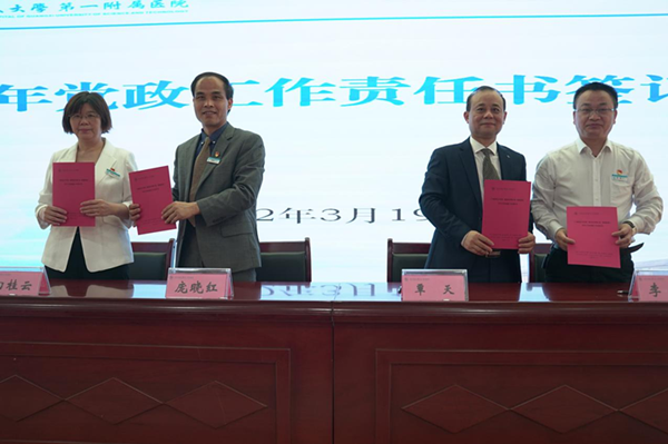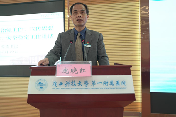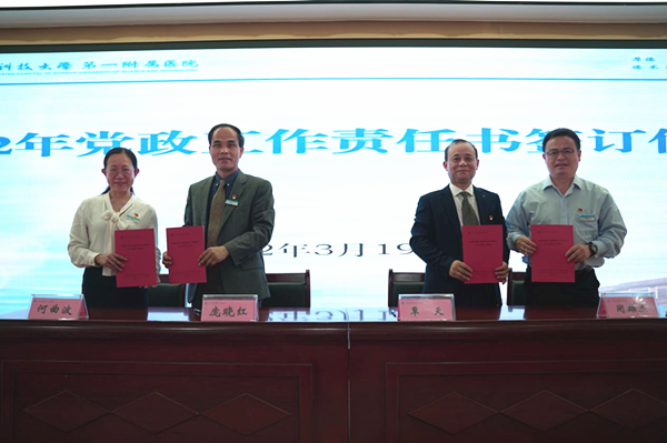 3月19日,广西科技大学第一临床医学院(第一附属医院)召开2022年全面从严治党、党风廉政建设工作、宣传思想及意识形态工作、安全稳定工作会议暨党政工作责任书签订仪式。党委书记庞晓红、党委副书记、院长覃天作讲话并与副职院领导、科室负责人代表签订党政工作责任书。党委副书记何曲波主持会议,纪委书记潘旭布置2022年党风廉政建设工作。大家“下决心、立任务、担责任”,共同为党建引领公立医院高质量发展贡献力量,全体院领导班子出席会议,全院各党支部书记、中层干部、护士长参加会议。