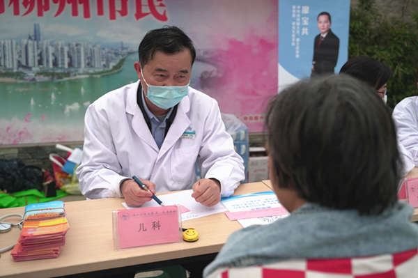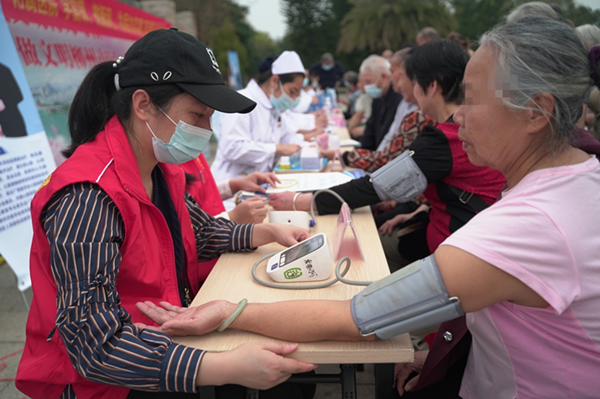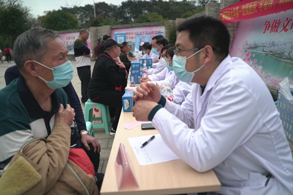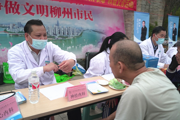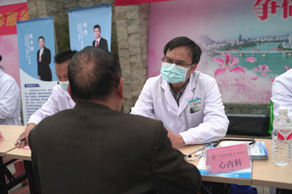 由门诊部及广西建工集团第三建筑工程有限责任公司志愿者提供的免费量血压、测血糖等健康服务吸引路过的群众纷纷参与进来。
