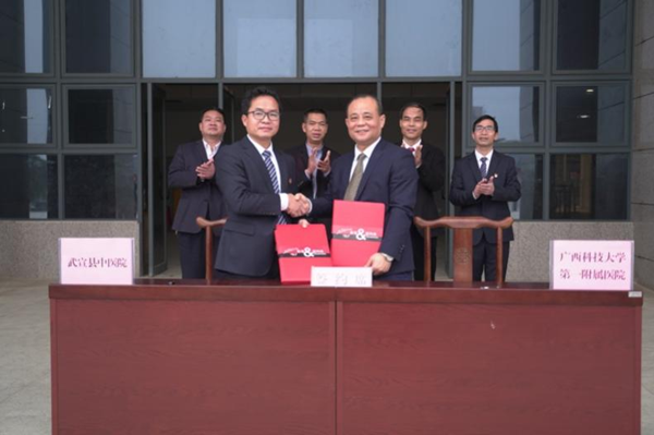 紧接着,党委副书记、院长覃天、武宣县中医院院长李康代表双方医院签订了紧密型医联体协议书。最后,参加签约揭牌仪式的主要领导共同为广西科技大学第一附属医院、武宣县中医院紧密型医联体进行揭牌并合影,仪式在一片欢乐祥和的氛围中圆满结束。(宣传科 辜丽娜文图)