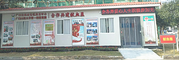 这间献血屋是由广西血液中心和广西科技大学第一附属医院两家单位合作共建、政府批准使用的,性质和功能与街上的献血屋、献血车一样。它坐落于广西科技大学第一附属医院的医技楼和住院南楼中间的小花园中,是一间长12米、宽3米的小平房,屋内的布置和街上的献血屋大体一致,唯一不同的是窗帘采用家庭式的白纱绸布,显得温馨、舒适。献血屋从2021年3月31日初步谋划,经过将近一年的筹备工作,于2022年的2月25日正式投入使用。目前采血时间是上午10:00至下午16:00,欢迎社会各界爱心人士前来参加无偿献血,感谢您的无私奉献!