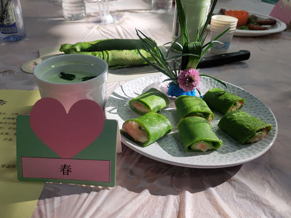 制法:菠菜取汁和以面粉,小火摊成面皮,土豆去皮蒸熟捻成泥,胡萝卜切丝,最后将土豆泥与胡萝卜丝置于面皮上卷成卷。