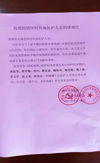 “好遗憾,不能和你们多说几句话,芒果熟了要来吃芒果。”回程在即,一队的队员温智慧和覃志敏收到了当地志愿者所写的感谢信,这两位队员都是二十出头的姑娘,在家里又何尝不是小公主一枚,然而身为白衣天使的使命感,让她们毅然投入到抗疫一线,体现了我院年轻人的责任和担当。同时,我院还有蒋姣华、覃雪梅等医疗队员都收到了当地村委的感谢信。