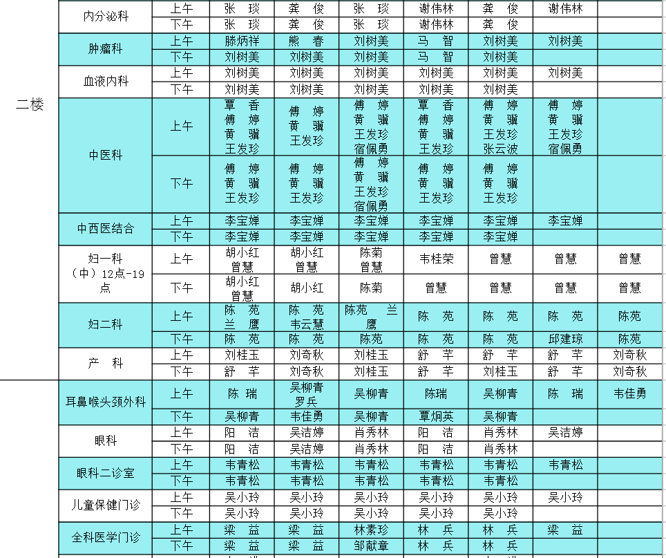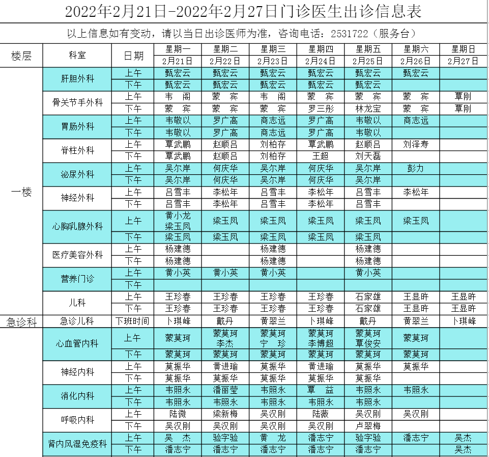 2022年2月21日-2022年2月27日门诊医生出诊信息表