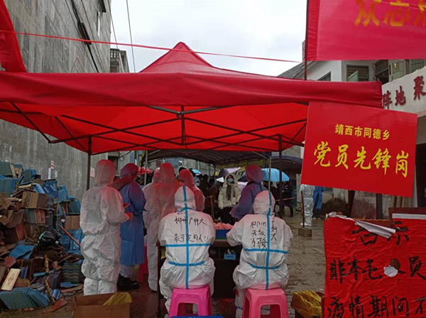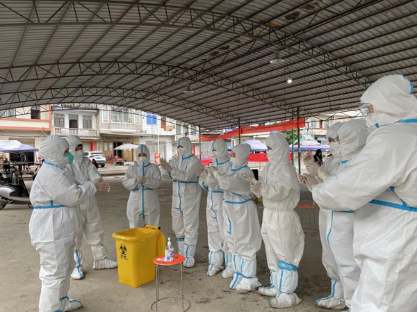 2月6日,春节未完,在自治区疫情防控指挥部的统一部署下,广西科技大学第一附属医院80名核酸采样队队员紧急集结,分两批出发百色。在这80名队员中,有11名中共党员。党旗所指,就是冲锋所在。核酸采样队强化党建引领,党员同志和入党积极分子勇于担当、敢打头阵,哪里任务艰难,哪里就有党员冲在第一线,充分利用电动车、三轮车、小货车等现有交通工具,克服种种困难,加班加点,与当地党员同志走街串巷、爬坡上坎,为40多个村屯的村民进行全员核酸检测,充分发挥党员的先锋模范作用,为全体队员作了榜样,队员们也深受党员同志所鼓舞,在此次核酸采样的工作期间,两队共计收到38份入党申请书。