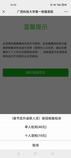 (2)10人混检费用为10元/人,但必须10个人同一时间到现场采样。如需混检请到服务台咨询,服务台电话:2531722。