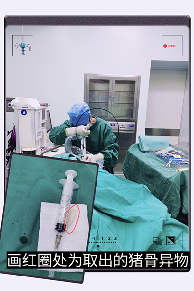 除夕夜下午,50岁的周阿姨因误吞猪骨后吞咽疼痛,门诊检查后拟“食管内异物”入院,入院后完善相关检查,排除手术禁忌症,于下午16点送手术室全麻下行硬性食管镜检查+经食管镜异物取出术,术中见一0.2㎝ⅹ0.5㎝ⅹ3㎝大小不规则猪骨异物嵌顿于食管壁,值班医生覃炯英为患者顺利取出异物,患者术后恢复良好。
