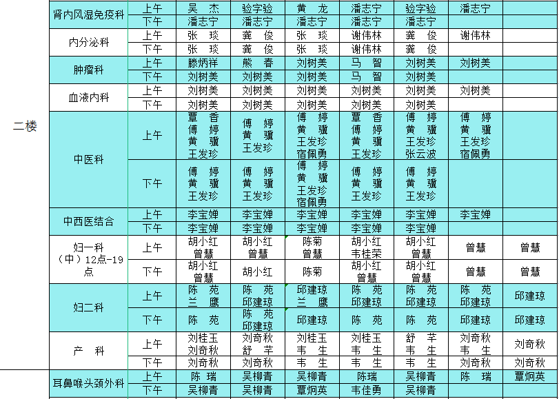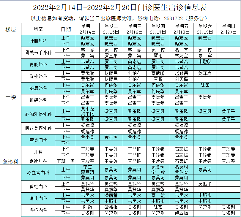 2022年2月14日-2022年2月20日门诊医生出诊信息表