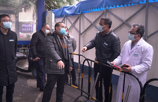 2月9日,党委书记庞晓红(右二),党委副书记、院长覃天(左二)带领相关科室负责人就临时增设核酸检测采样点进行实地检查