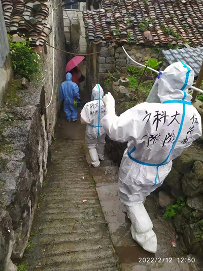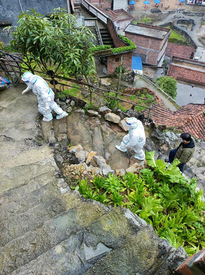 我院驰援百色的医护人员,主要在靖西市同德乡、平果市果化镇等地进行入户核酸采样工作,这些地方的一些村屯地处山区,民居依山而建。下雨湿滑、道路泥泞,这些都没有拦住白衣天使们的脚步,爬坡上坎,他们铭记着作为党员的义务:一定要守护群众生命安全,完成上级交给的任务。