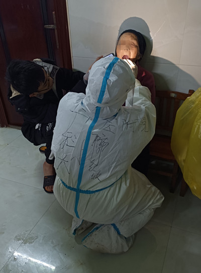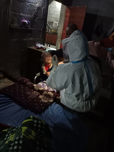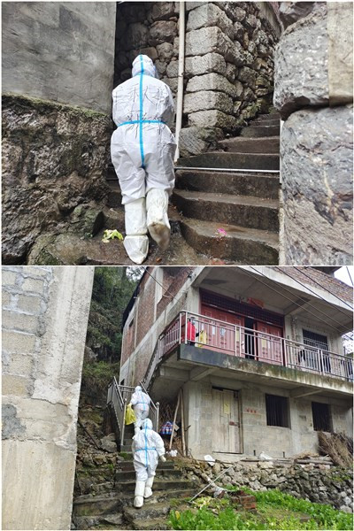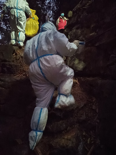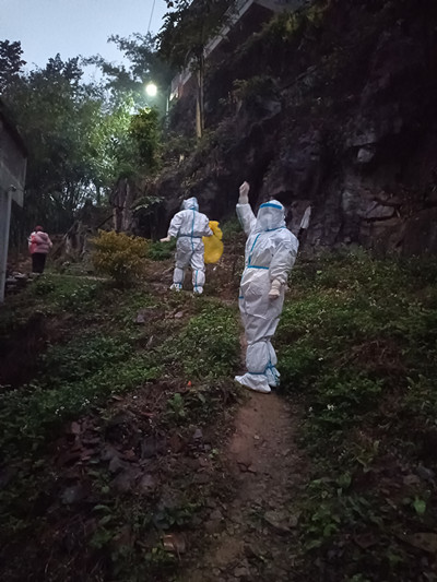 下午4点,一名当地的志愿者带着郭红波开始爬山入户采集。从头到脚穿着密不透风的防护服,正常行走和呼吸都不太方便,更何况还要上山下山再上山再下山,难度可想而知。寒风夹杂着冰雨,山路崎岖泥泞,才走了几户人家就已经汗流浃背,全身上下黏糊糊的,防护面屏和N95口罩里的水不停往下流,天没黑都看不清路,郭红波只能从面屏下的缝隙分辨山路的高低。穿过猪圈和羊棚,爬上湿滑的木头台阶,防护鞋套坏了3双,鞋子不知什么时候都进水湿透了。年近半百的郭红波体力严重不支,几次憋得要窒息,不得已摘下面屏呼吸调整几分钟后又接着干,入户、扫码登记、手消、核酸采样……工作就这样默默地坚持着。