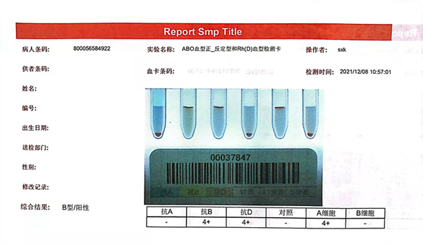 我院全自动血型分析仪检测B型RhD阳性血型图片