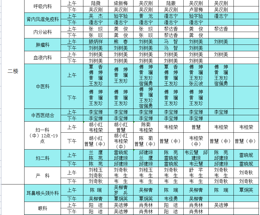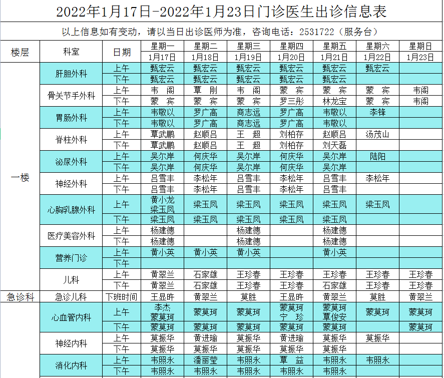 2022年1月17日-2022年1月23日门诊医生出诊信息表