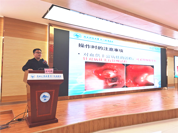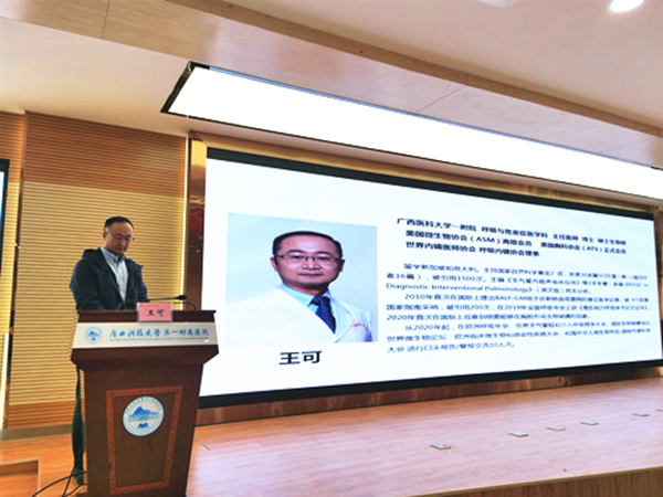 广西科大一附院呼吸内科梁新梅主任在此次学术活动中,对肺结节全程管理、鉴别诊断和早中晚期非小细胞肺癌治疗选择进行讲授;乐文俊主治医师在会上分享了呼吸内镜介入手术的一些心得体会,并以病例分享为导引讲授呼吸内镜介入手术下出血的预防和处理。