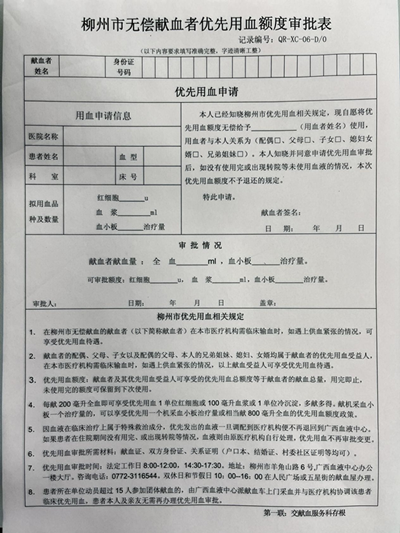 1.到医院输血科填写《柳州市优先用血额度审批表》;