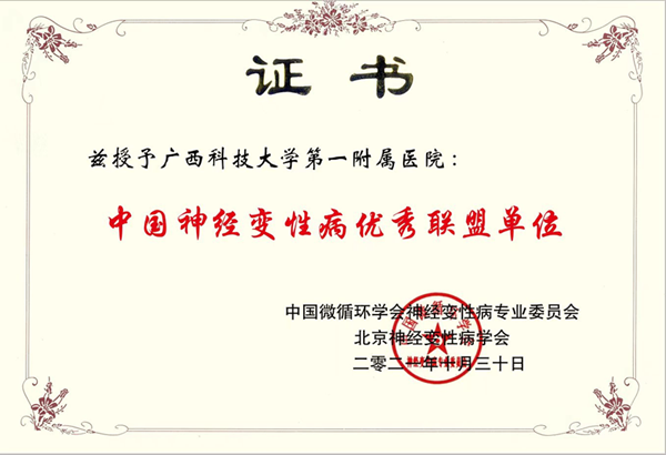 中国微循环学会是从事微循环领域相关研究和学术交流的国家一级学会,神经变性病专业委员会。委员会致力于神经变性疾病领域的学术研讨,技术创新、临床实践以及交流协作,在神经变性病的发病机理、临床治疗、综合防治等领域取得突破性进展,探索出一条适合于我国医疗体制的创新发展。我院于2019年第一批加入中国神经变性疾病联盟,获得“高级示范中心荣誉称号”。