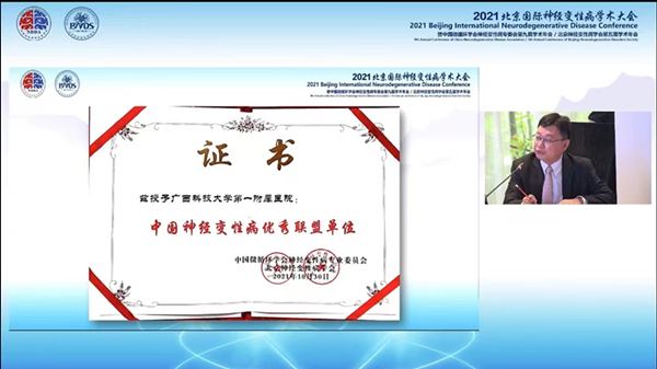 10月30日,在2021北京国际神经变性病学术大会暨中国微循环学会神经变性疾病专委会第九届学术年会上,广西科技大学第一附属医院获“中国神经变性疾病优秀联盟单位”荣誉称号,我院为全国今年唯一被授予此殊荣的单位。