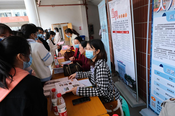 在双选会现场,柳州市社会福利医院、武宣县中医院、象州县中医院等我院多家医联体单位,用多个优质岗位和富有吸引力的条件向毕业生们抛出了橄榄枝。多家基层医院还在学术报告厅对自家医院的基础条件、设施设备、人才政策、科研发展等情况进行了宣讲,宣讲会上座无虚席,不少志愿投身于基层健康事业的学生都参与聆听。