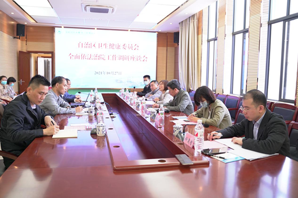 10月27日上午,自治区卫生健康委员会调研组至我院调研依法治院工作。由自治区卫健委法规处(审批办)处长(主任)闫文等调研组领导及成员,对我院推进法治建设、法治队伍建设、依法科学民主决策、医疗纠纷处理、学法用法、普法宣传 、法律顾问、严格守法等工作进行走访及指导,柳州市卫健委党组成员危寿明主持座谈会,我院党委书记庞晓红,党委副书记、院长覃天,纪委书记潘旭、副院长张施明等院领导陪同调研。