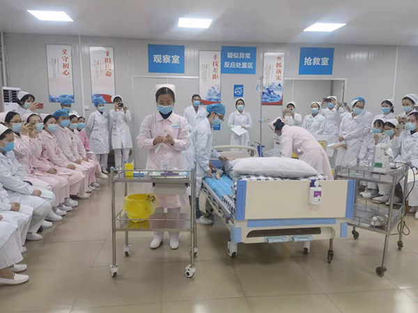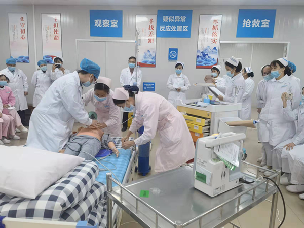 为安全、有效推进3-11岁人群新冠病毒疫苗接种工作,加强新冠疫苗接种医疗保障,提高医护人员对接种严重不良反应的救治能力,全力做好疫苗接种异常反应医疗救治工作,11月3日17时,广西科技大学第一附属医院医务部、护理部、儿科、疫苗接种点精心组织了3-11岁新冠病毒疫苗接种异常反应急救演练。