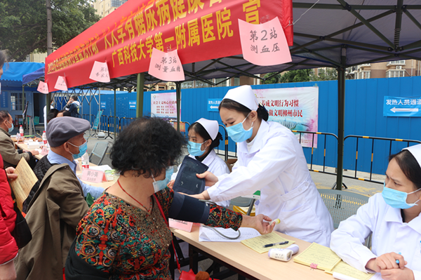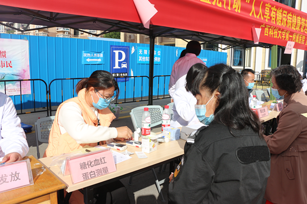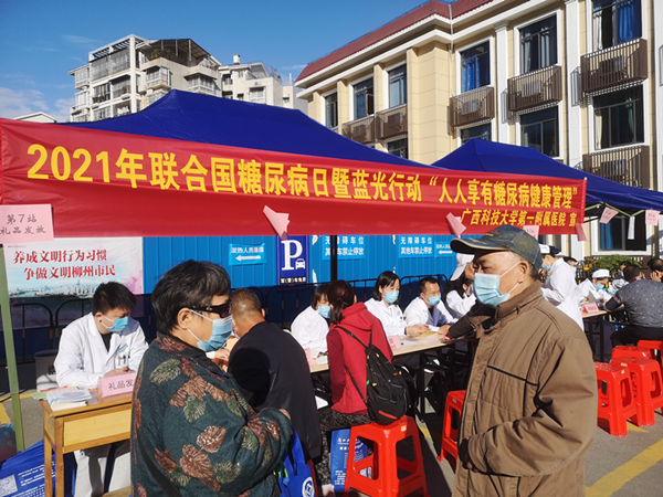 为迎接联合国糖尿病日暨“蓝光行动”,广西科技大学第一附属医院内分泌科于11月9日08:30-11:30在医院门诊楼前举行糖尿病义诊活动。2021年联合国糖尿病日主题是“人人享有糖尿病健康管理”,让更多的糖友及其家人们共同参与到我们的抗糖行动中,让更多的糖友掌握糖尿病相关知识,正确认识并积极应对糖尿病,让大家远离糖尿病的危害,赢得健康生活。