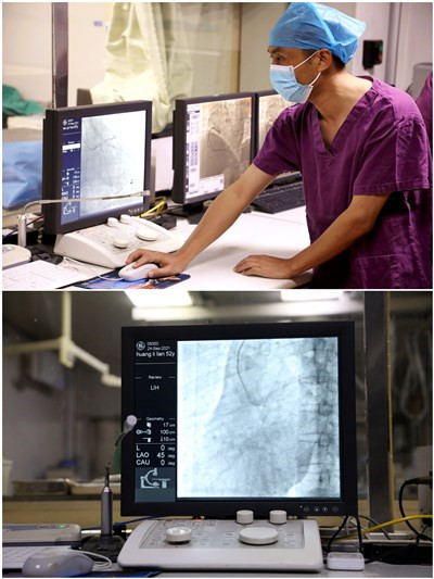 “1分42秒,我们的造影术完成了!通过仪器可以看到,你的心血管没什么大问题,不需要做支架,放心吧。”上月末一天的早上9点,在广西科技大学第一附属医院(广西科大一附院)胸痛中心的介入手术室里,五位医护人员麻利地完成手术筹备工作后,在胸痛中心张施明副院长的指导下,为一名感觉胸闷的女患者进行了一场冠状动脉造影术。手术时,为了缓解紧张的气氛和状态,张施明跟患者拉家常,询问一些基础情况,不知不觉中,随着导管从患者右手腕动脉处慢慢进入心脏,监视器上心脏血管的情况一目了然。这是一例情况不严重的病例,造影术后患者只需要吃些药缓解一下。手术床上,全程清醒并可以看到医生整个手术过程的患者,露出了开心的笑容。