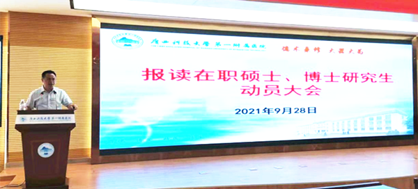 为了进一步提升医院人才队伍建设,促进医院学科的发展,9月28日下午5点,广西科技大学第一附属医院在学术报告厅召开报读硕士、博士研究生动员大会,副院长闭雄杰出席会议并讲话,全院本科及以上学历但未报考硕士、博士研究生的45岁以下人员参加会议。教学科科长左美玉主持会议。