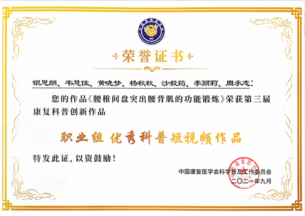 同时,广西科技大学李雪忠团队的《颈椎康复科普小知识》,获得最具价值康复科普创新作品学生组优秀短视频荣誉。